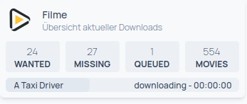 Auf der Statusseite werden Filme oder Serien, die aktuell heruntergeladen werden unter der jeweiligen Kachel angezeigt. Die verbleibende Downloadzeit ist immer 00:00:00, aber der Balken zeigt den tatsächlichen Fortschritt. Hierüber könnt ihr nachschauen, ob auch heruntergeladen wird, was ihr hinzugefügt habt.